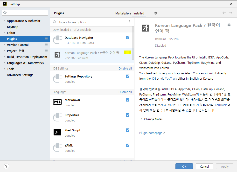 pycharm을 최신 버전으로 업데이트했을 때 메뉴가 전부 현지화(한글) 되어 버렸다. 아마 IntelliJ를 포함해서 JetBrains에서 나오는 모든 프로그램이 동일하지 않을까 하는 예상됩니다. 메뉴를 영어로 되돌리고 싶으신 분들은 최신 버전으로 업데이트될 때 자동으로 설치된 "Korean Language Pack / 한국어 언어 팩" 플러그인을 제거해주면 됩니다.