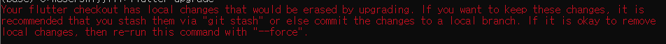 Your flutter checkout has local changes that would be erased by upgrading. If you want to keep these changes, it is